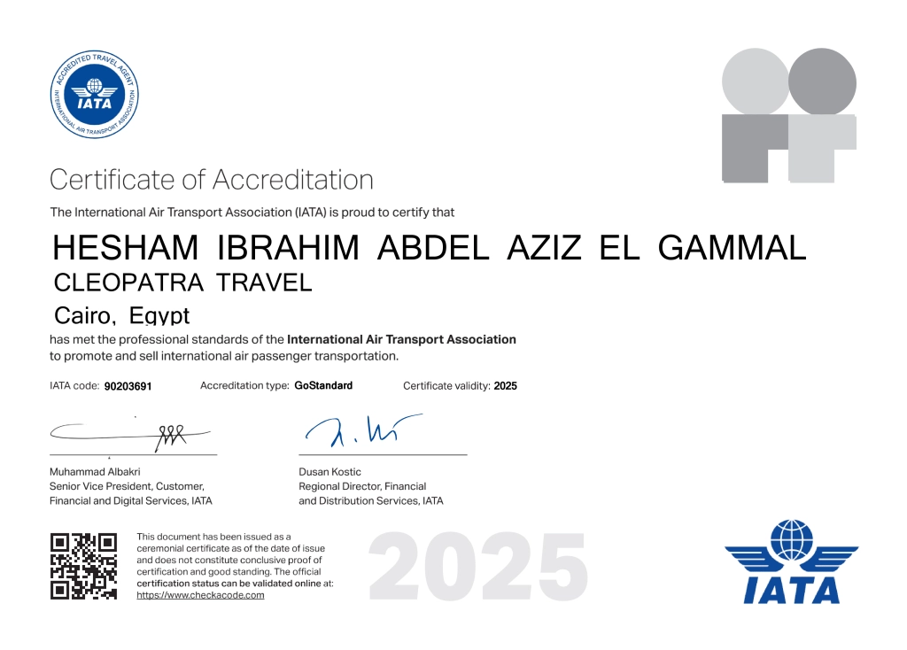We are licensed by the Egyptian Ministry of Tourism & Antiquities, and we are also an IATA member. These credentials verify our reliability and legitimacy.
