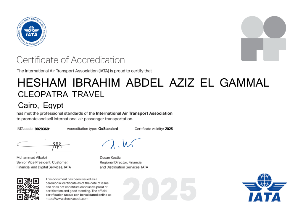 We are licensed by the Egyptian Ministry of Tourism & Antiquities, and we are also an IATA member. These credentials verify our reliability and legitimacy.
